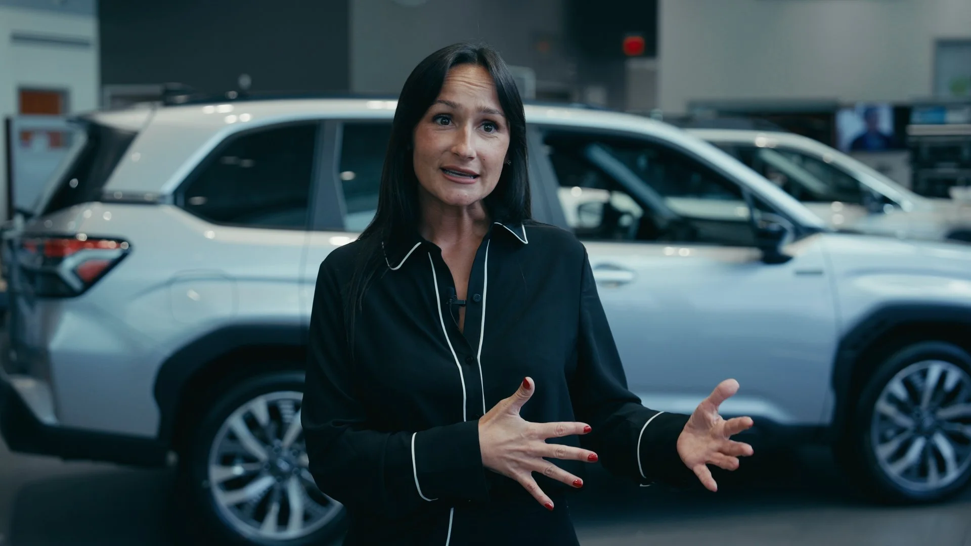A smiling man with a beard and short curly hair, wearing a light gray jacket over a white turtleneck, standing inside a modern car dealership showroom with cars and artwork in the background.