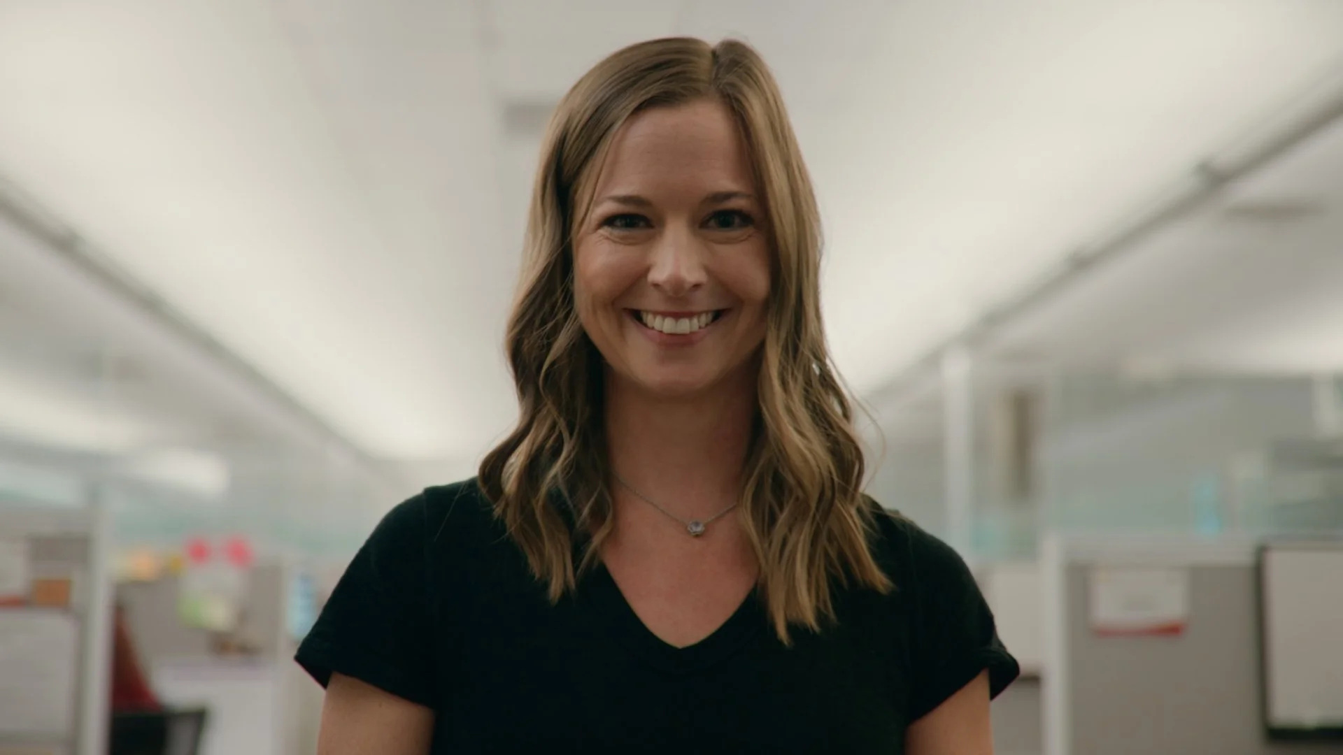 A woman with wavy brown hair, blue eyes, and light skin, wearing denim overalls and a gray shirt, standing indoors with a room and window in the background.