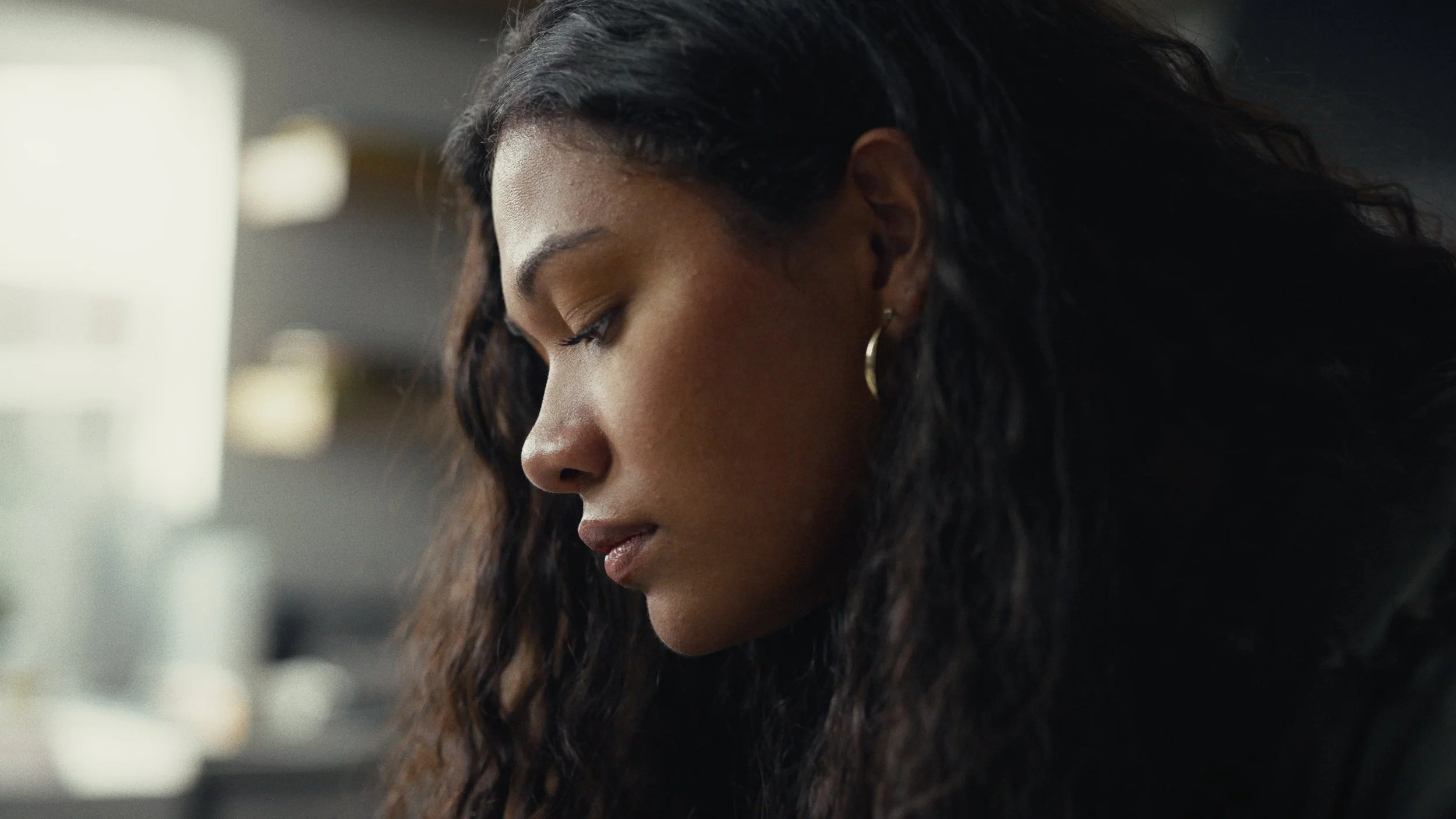 Close-up of a woman with blonde hair, resting her head against a window with a blurred building in the background.